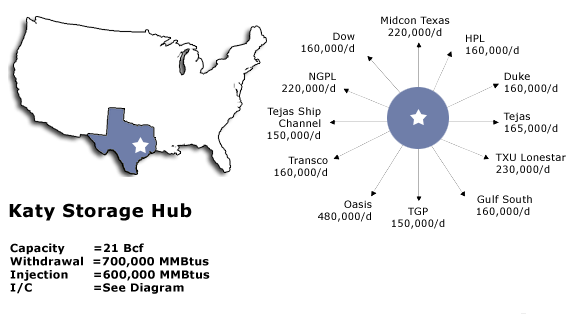 The 21 Bcf Katy facility, located near Houston, has been in operation for more than ten years and serves a diversified customer base throughout the region. It is also a major gathering point for Texas producers.