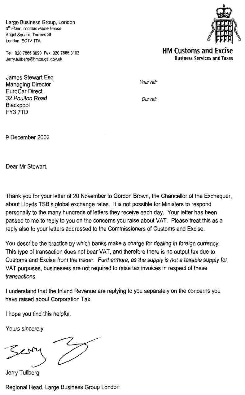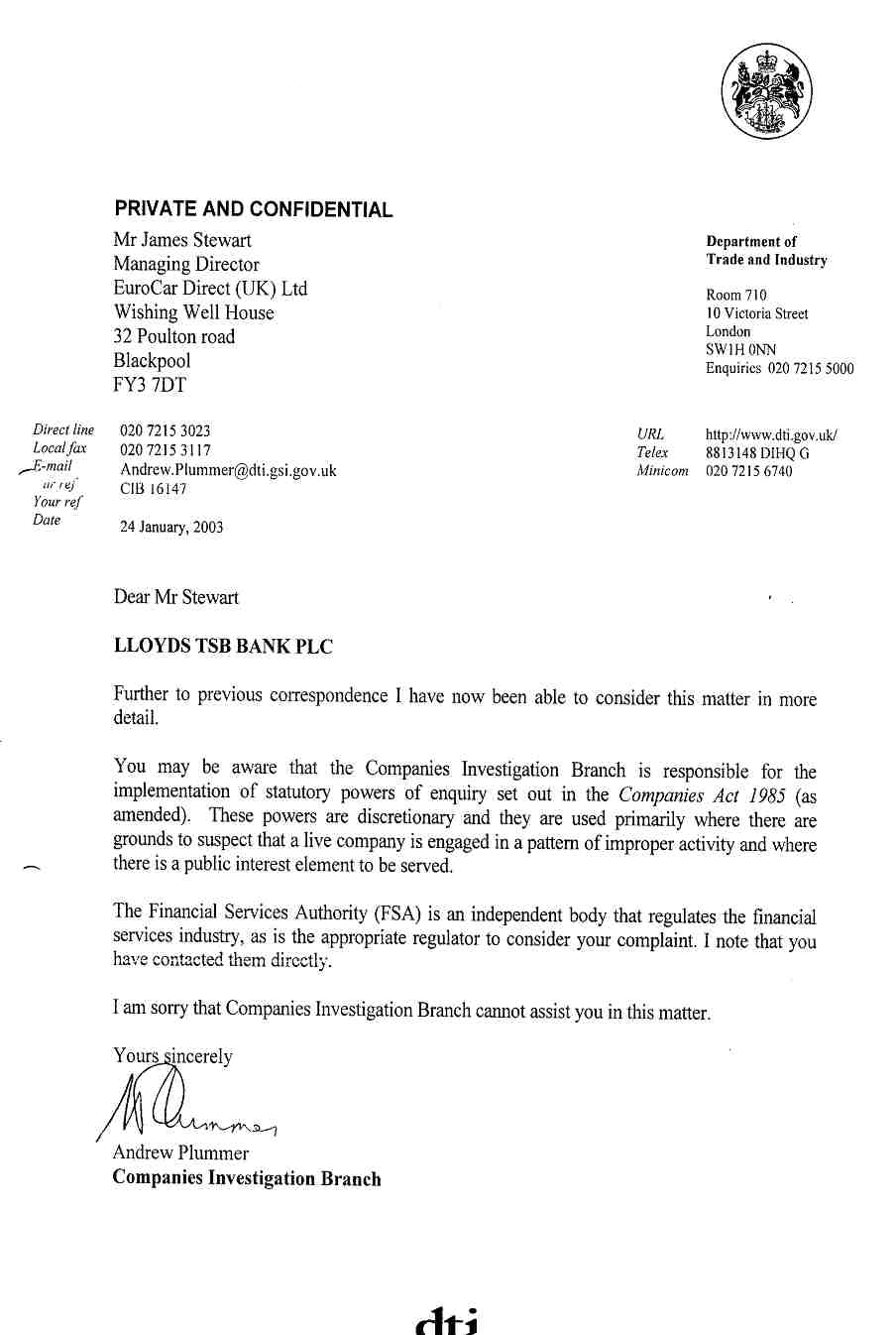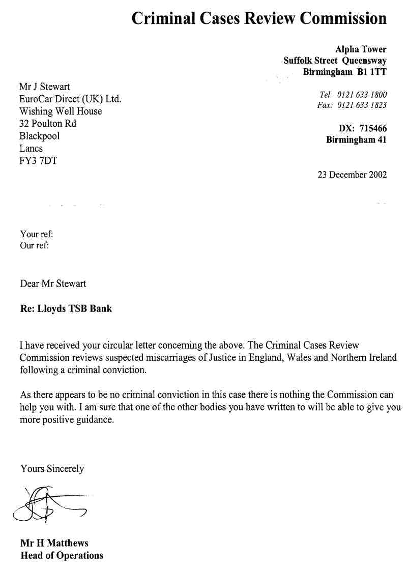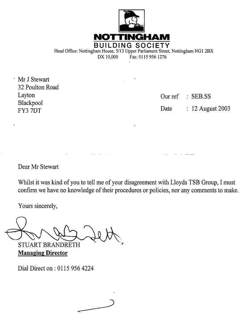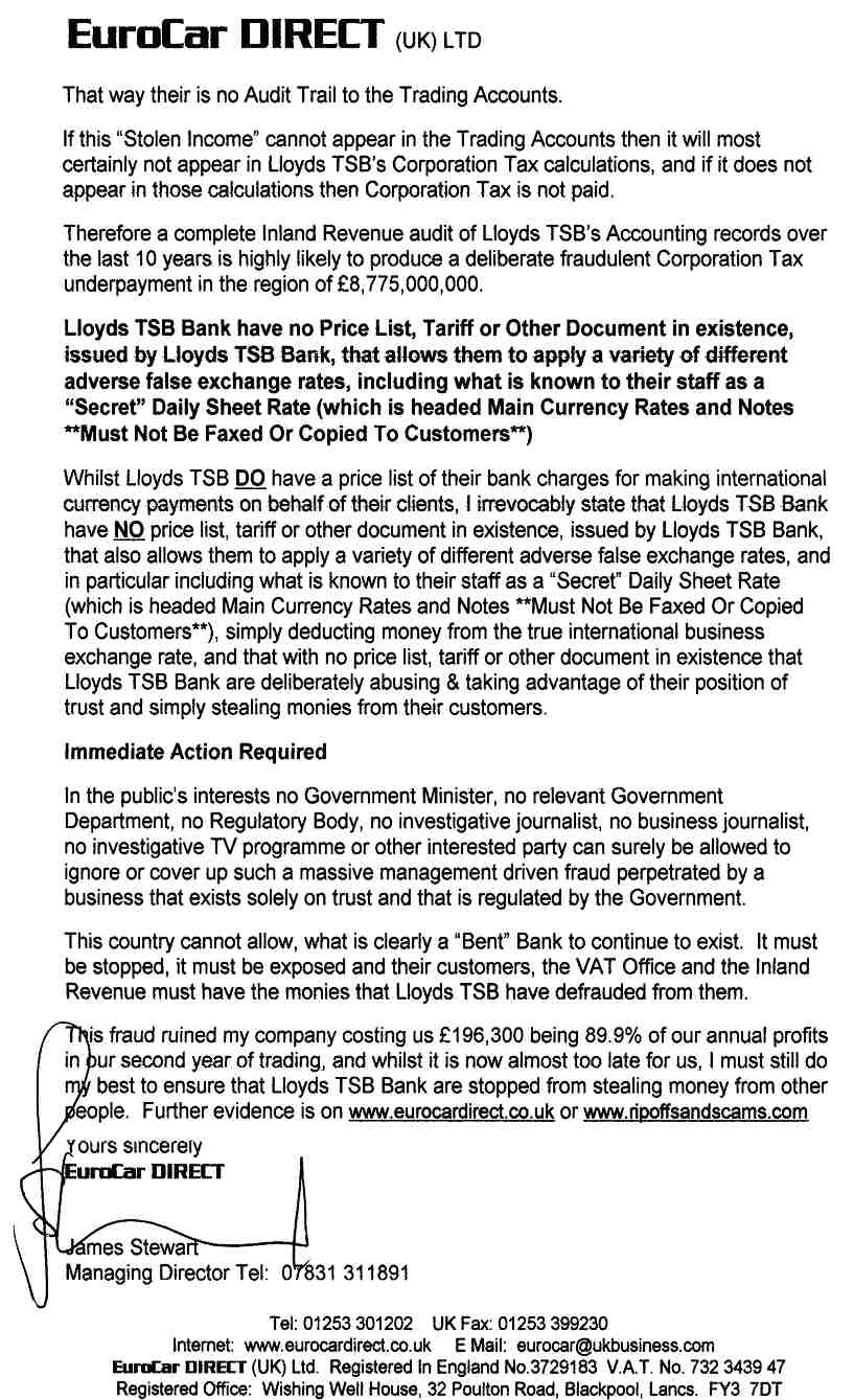 An honest reasonable person, in a "supposedly" honest democratic country like the UK, would expect that if there was some sort of little scam going between Lloyds TSB and a few others in the key positions of power, i.e. regulatory etc., that once this letter was distributed, then Lloyds TSB would be stopped.