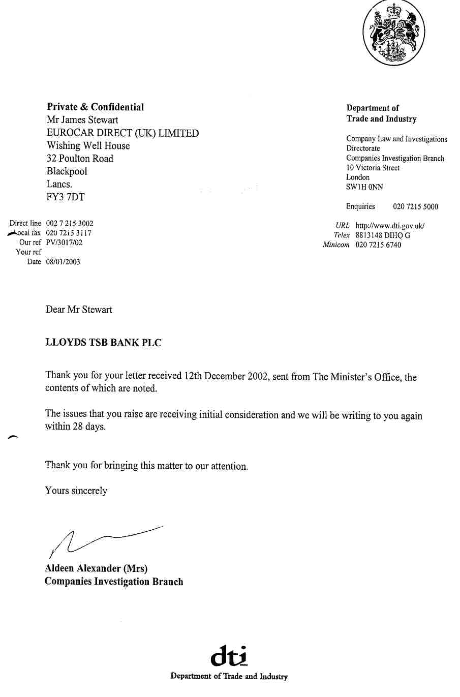 Well, the DTI answered on behalf of the Ministers Office (Which Minister?) with a "Quick" acknowledgement on dated 08-Jan-03.