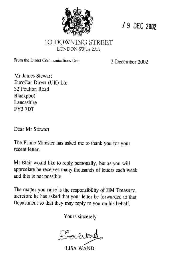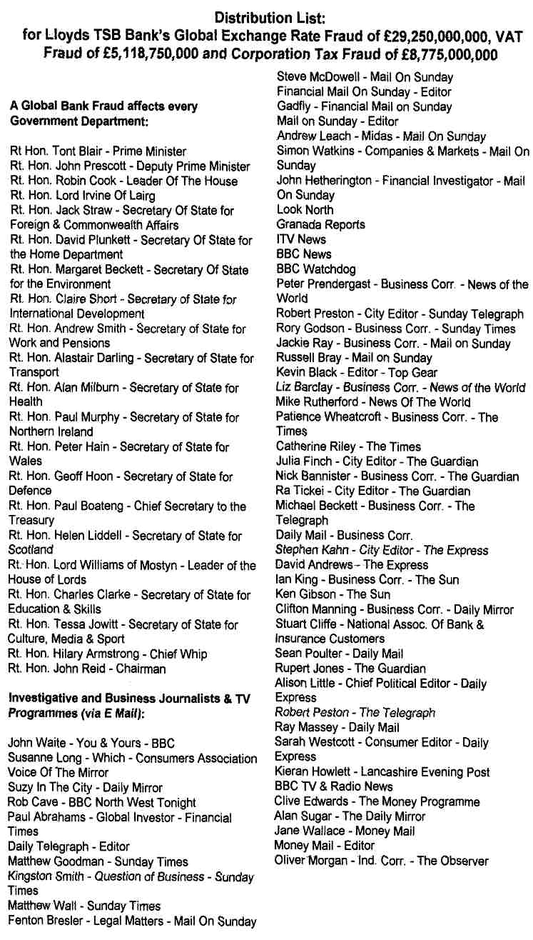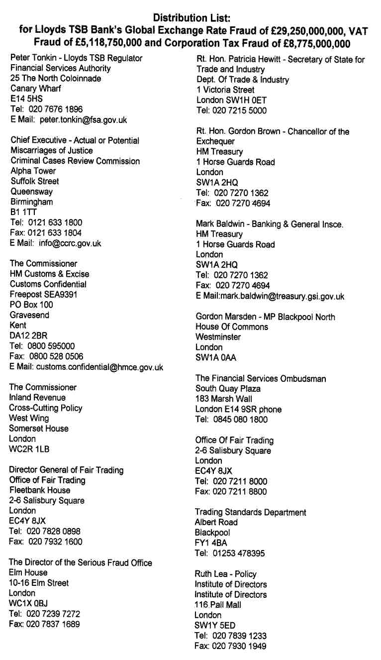You can't go any higher than to contact the Prime Minister, all members of the Cabinet and the chiefs of every Government Department. To ensure that they investigated properly you will see that the letter was also sent to all of the investigative journalists, indeed everyone who was already on the media list and had already been contacted by E Mail over 31 times up to that date. You will also see that it went to other supposedly investigative organisations like the Office Of Fair Trading, Institute of Directors, indeed even to the Director of the Police's Serious Fraud Office.