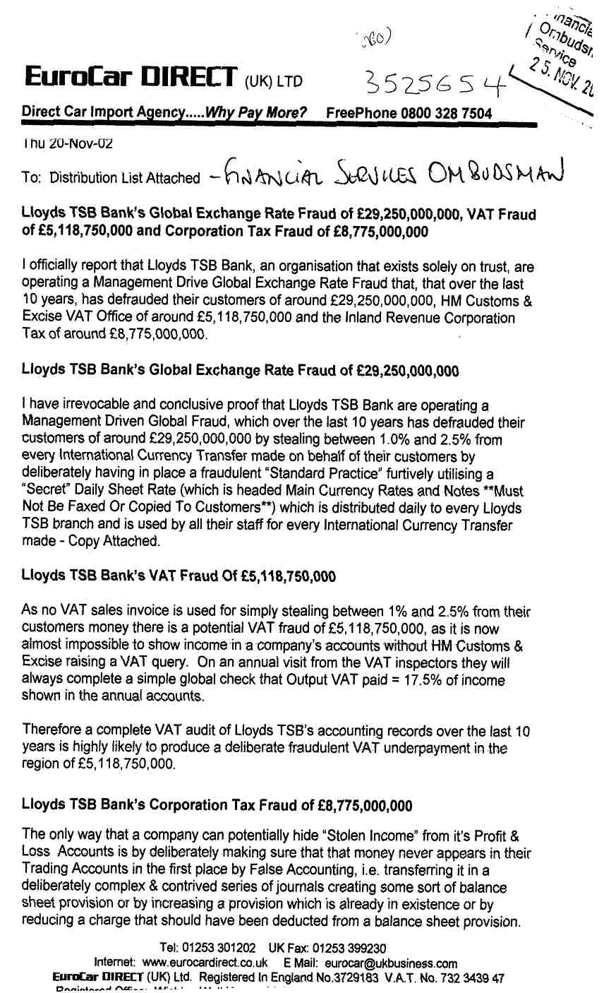 You will see that way back on 20-Nov-02, I decided to send this letter to everyone that I thought was in a position of authority to do something about Lloyds TSB countrywide False Exchange Rate Fraud "MUST NOT BE FAXED OR COPIED TO CUSTOMERS".