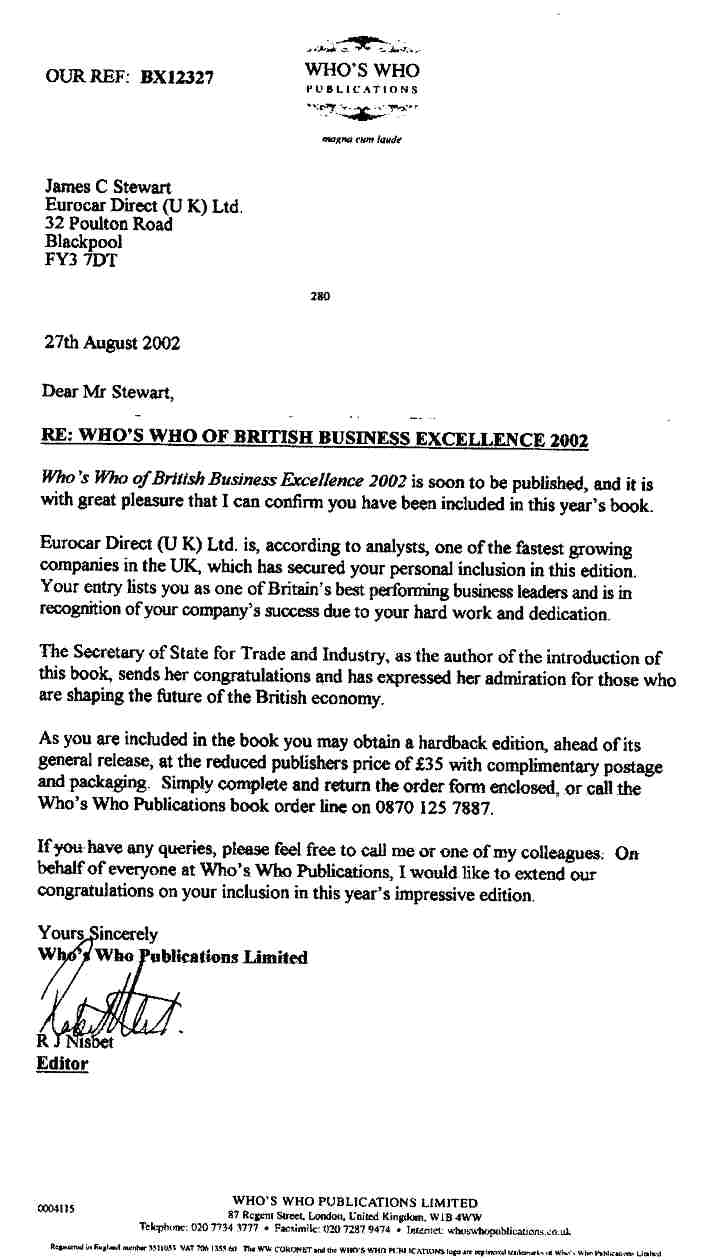 I even attached a letter informing me that I was in "Who's Who Of British Business Excellence" (incidentally only awarded because of real accounting statistics at Companies House and quite obvious, even to a blind man with no dog, not because of who I know), which, a normal reasonable honest man would believe, should add to my credibility.