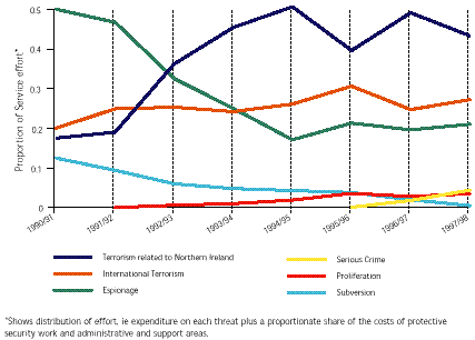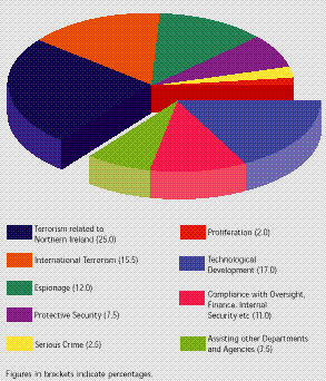 The Security Service budget for the financial year 1997/98 was less than £140m. Direct expenditure on the Services core areas of work accounted for around two-thirds of the total budget, apportioned as follows: