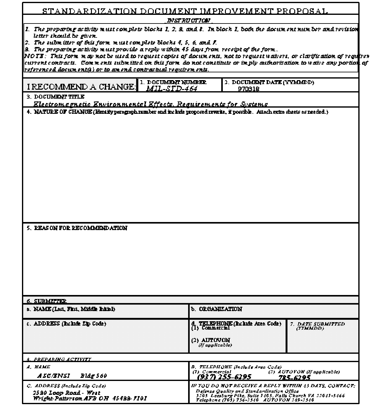 5. Comments and data which may be of use in improving this document should be addressed to: USAF/Aeronautical Systems Center, ASC/ENSI, 2530 Loop Road West, Wright-Patterson AFB, OH 45433-7101, by using the Standardization Document Improvement Proposal (DD Form 1426) appearing at the end of this document or by letter.