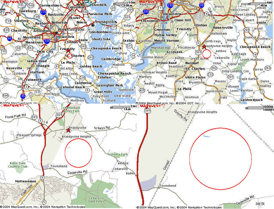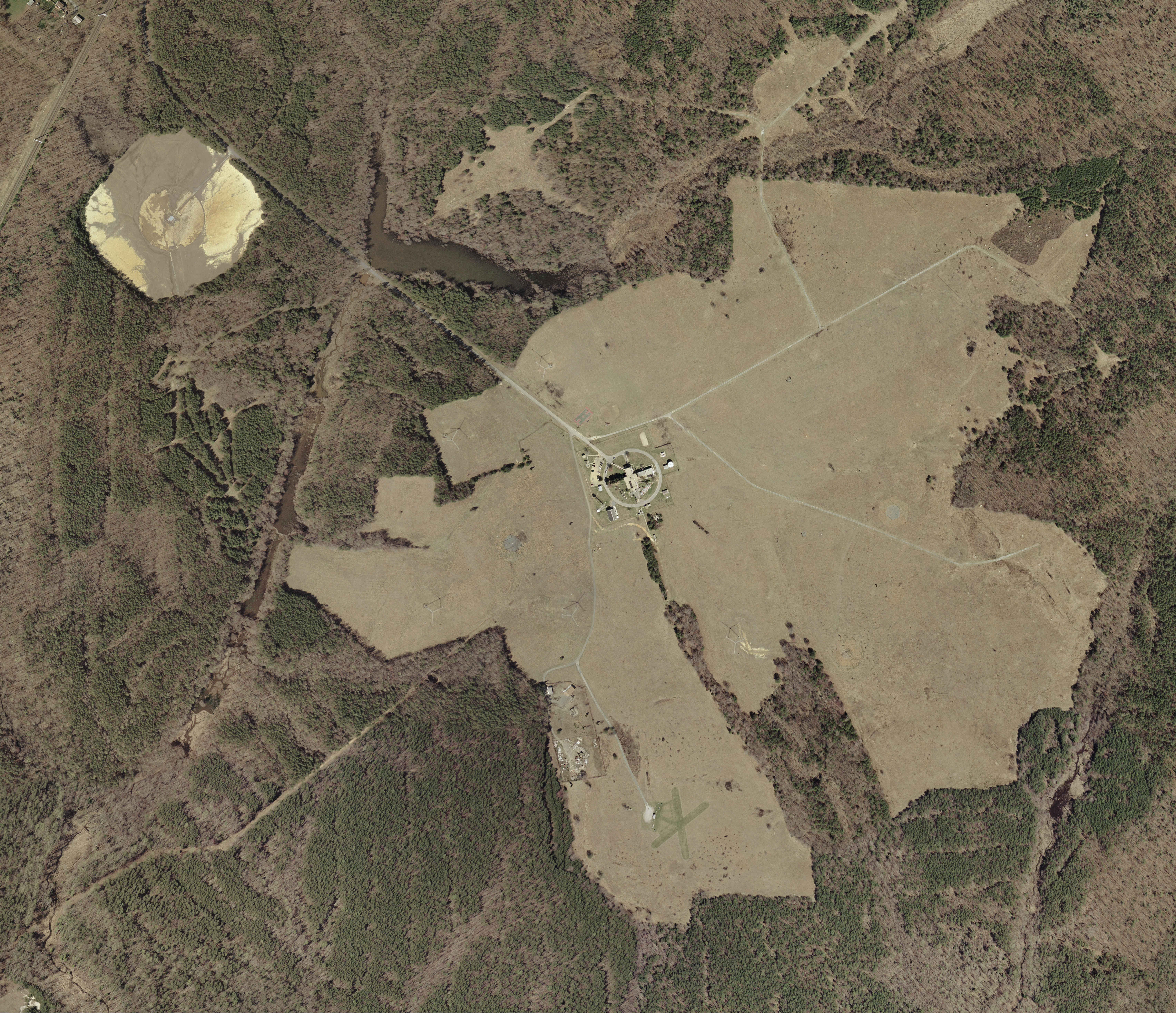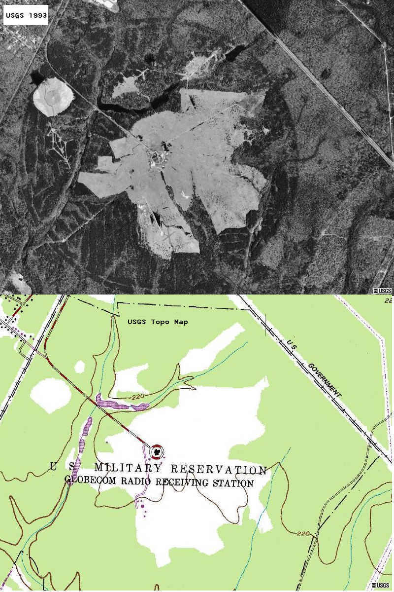 The giant circular imprint of the station is unusual. It might indicate a buried antenna or a perimeter security sensor system. There are several types of antennas on the site: a central triangular tower, single poles, poles with three-prong tops, several types of multi-antenna arrays, the strange green cross at bottom. There's an imprint of a circular Wullenweber antenna at upper left.