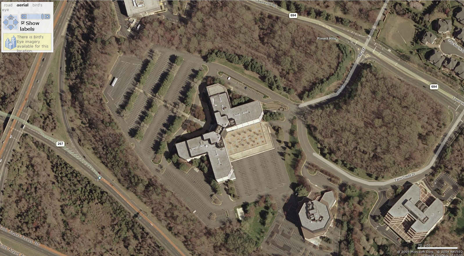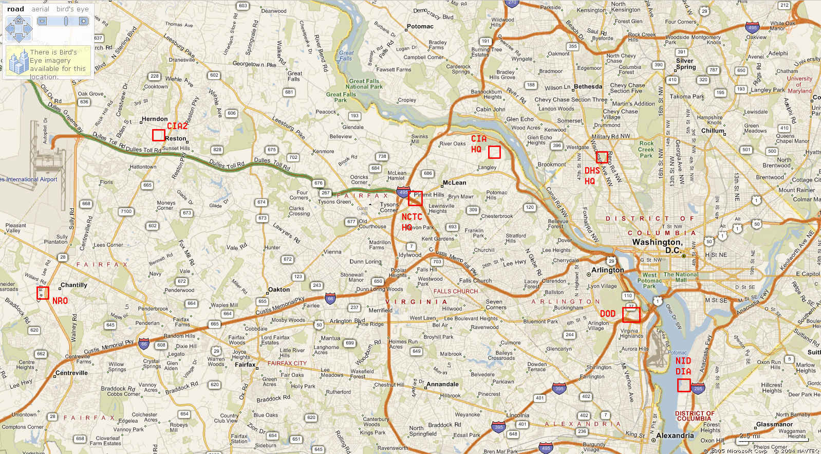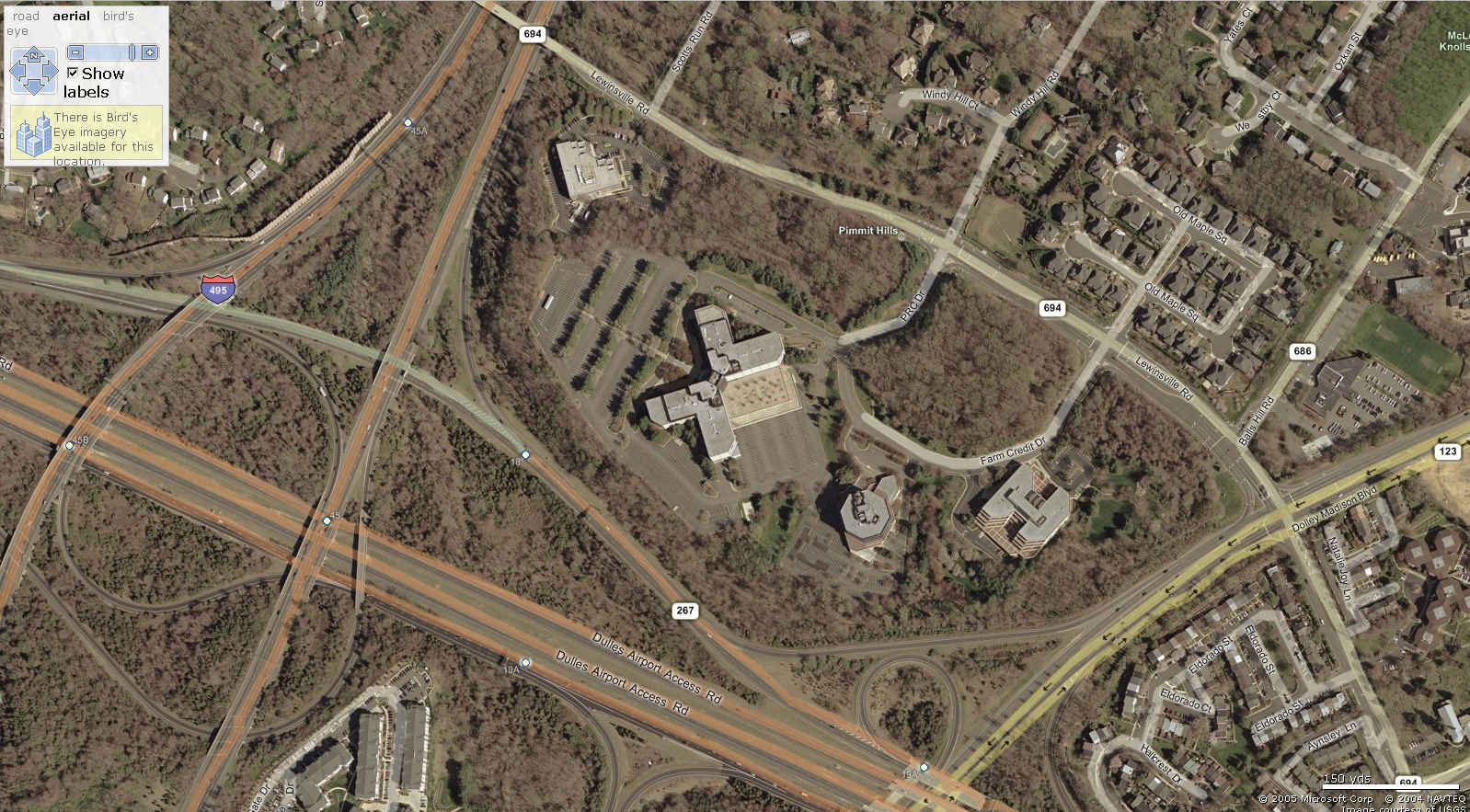 This very morning, in http://www.washtimes.com/specialreport/20060205-011422-6269r.htm, the estimable Bill Gertz wrote:"For example, despite the fact that the new National Counterterrorism Center is housed in the same Tysons Corner office building in suburban Virginia as the CIA Counterterrorism Center and the Pentagon's Joint Intelligence Task Force-Counterterrorism, the centers do not easily share information among themselves, the officials said."Viewed through the lens of Google, that takes one to 38.9327 N, 77.2057 W. One wishes they would be nice, get along out there.