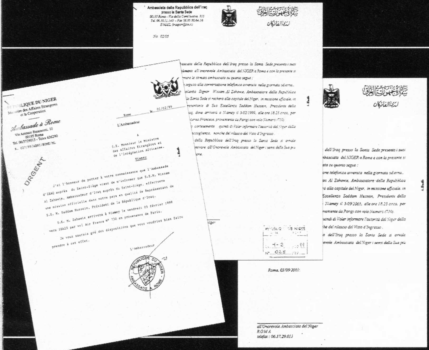 1) A letter in Italian from the Iraqi ambassador to the Holy See received by the Niger embassy on February 1, 1999, confirming Mr. Zahawie's forthcoming trip to Niger. Probably authentic.