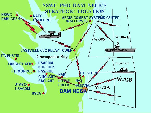 Dam Neck is located on the oceanfront in Virginia Beach, Virginia, 5 miles from the city's resort area. NAVSEA Dam Neck is a tenant of the Fleet Combat Training Center, Atlantic. Dam Neck's strategic location places it in the center of major multi-service commands. With its existing complex of mockups, computers, live data links, radars, sensors and weapons systems, the facility provides an ideal environment for multi-service test activities. This capability is further enhanced by the Cooperative Engagement Capability (CEC) Land Based Test Site (LBTS) located in the facility. Dam Neck's strategic location allows real-time interfacility testing via microwave and landline links with the AEGIS Combat Systems Center (ACSC) at Wallops Island, VA, and fleet units in Norfolk pierside or operating at sea in the VACAPES OP area operating individually or as a battle group.