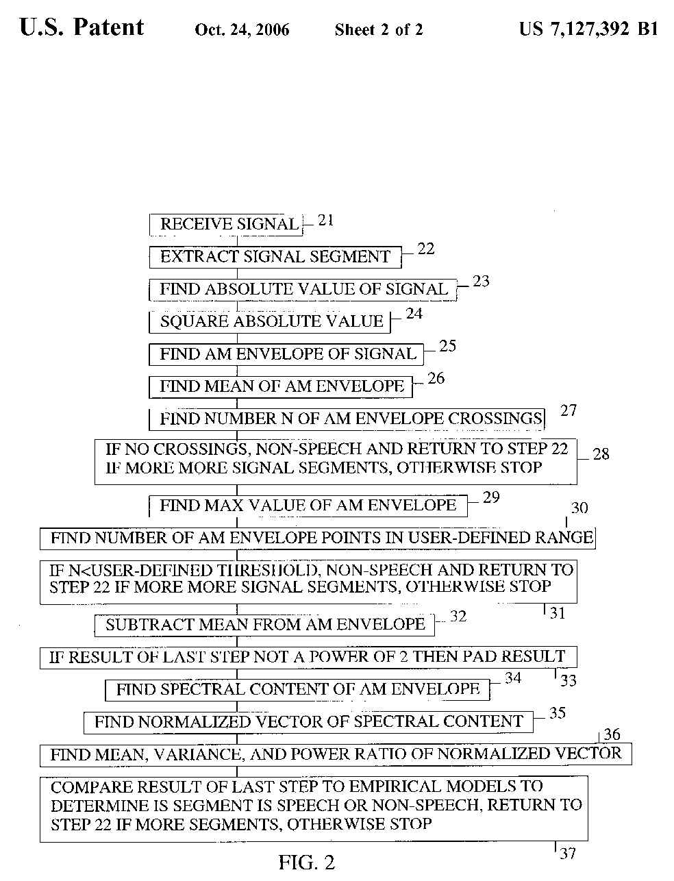 The present invention is a device for and method of detecting voice activity. First, the AM envelope of a segment of a signal of interest is determined. Next, the number of times the AM envelope crosses a user-definable threshold is determined. If there are no crossings, the segment is identified as non-speech. next, the number of points on the AM envelope within a user-definable range is determined. If there are less than a user-definable number of points within the range, the segment is identified as non-speech. Next, the mean, variance, and power ratio of the normalized spectral content of the AM envelope is found and compared to the same for known speech and non-speech. The segment is identified as being of the same type as the known speech or non-speech to which it most closely compares. These steps are repreated for each signal segment of interest.
