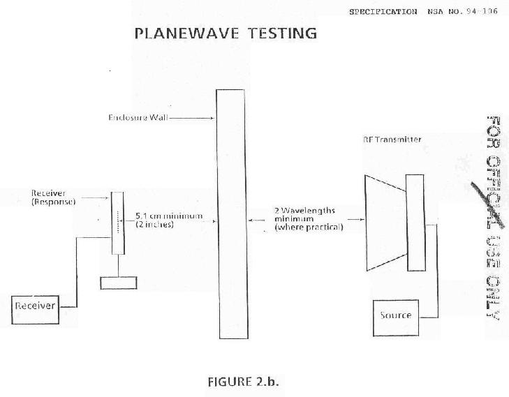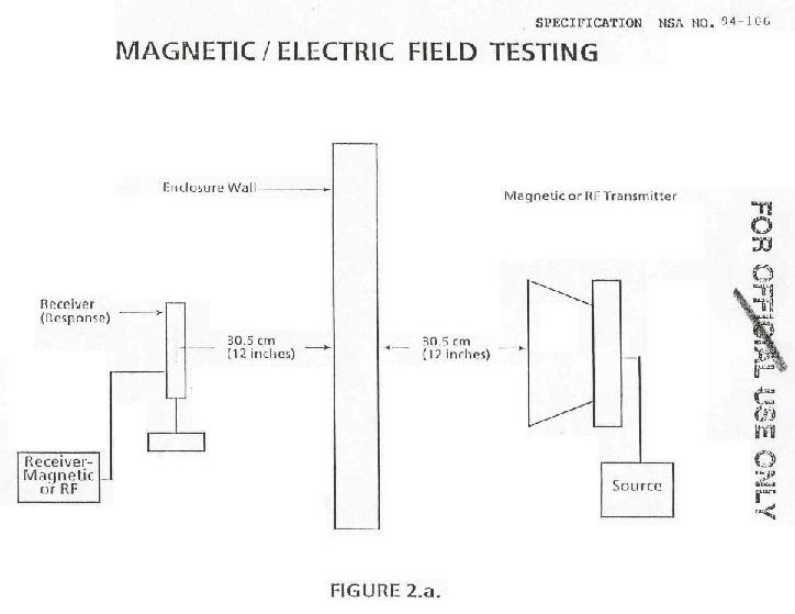 4.3.1.2 Magnetic/Electric/Plane Wave Test. The magnetic and electric f ield attenuation tests shall be performed with the antennas located directly opposite each other and separated by a distance of 61 centimeters (24 inches) plus the wall thickness (See Figure 2.a.) Magnetic field attenuation shall be measured at 1 kHz, 10 kHz, 100 kHz, and 1 MHz. Electric field attenuation shall be measured at 1 kHz, 10 kHz, 100 kHz, 1 Mhz, and 10 MHz. The plane wave attenuation test shall be performed with the transmitting antenna placed at least 6 meters away from the enclosure surface (where practical) and the receiving antenna set no closer than 5.1 centimeters (2 inches) from the wall (See Figure 2.b.) Plane wave attenuation shall be measured at 100 MHz, 400 MHz, 1 GHz, and 10 GHz. Measurements, for all tests, shall be taken with the antennas oriented for maximum received signal strength. Attenuation tests shall be performed around the entire door frame, air ducts, filters and through any accessible joint or penetration. In addition, the magnitude and location of the maximum signal level emanating from the enclosure shall be determined by testing at least f our locations. The selection of testing locations should include not only walls, but also the floor and ceiling. Tests shall be performed, at a minimum, on every 180 square feet of surfade area. All test locations and results shall be documented. The lowest attenuation level performed from all the tests shall be recorded as the attenuation of the enclosure. If possible, all tests should be performed with the receiver outside and the transmitter inside the enclosure. The Government reserves the right to require tests at specific frequencies and locations to determine compliance of the enclosure with this specification.
