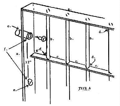 b. Horizontal Steel Supports - Minimum of 1/4" thick by 1 1/2" wide and vertical nor more than 18" apart. The horizontal supports are to be drilled so that vertical bars can be passed through them and be spot welded in place prior to installation.