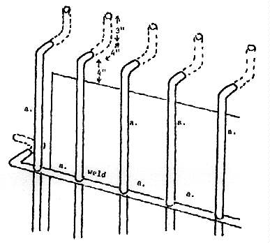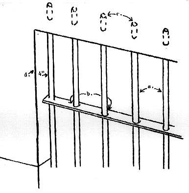 a. One-half inch diameter steel bars are used to form a grillwork that is to be imbedded into the masonry wall around the window opening. Vertically the bars must be no more than 6" apart; horizontally, nor more than 18" apart. Horizontally the bars must be welded to each vertical bar. The point where the bar ends, both vertically and horizontally, and enters the masonry must be a minimum of 4" from the edge of the opening. The angled bar ends extend into the masonry a minimum of 4" with the bent end being a minimum of 3".