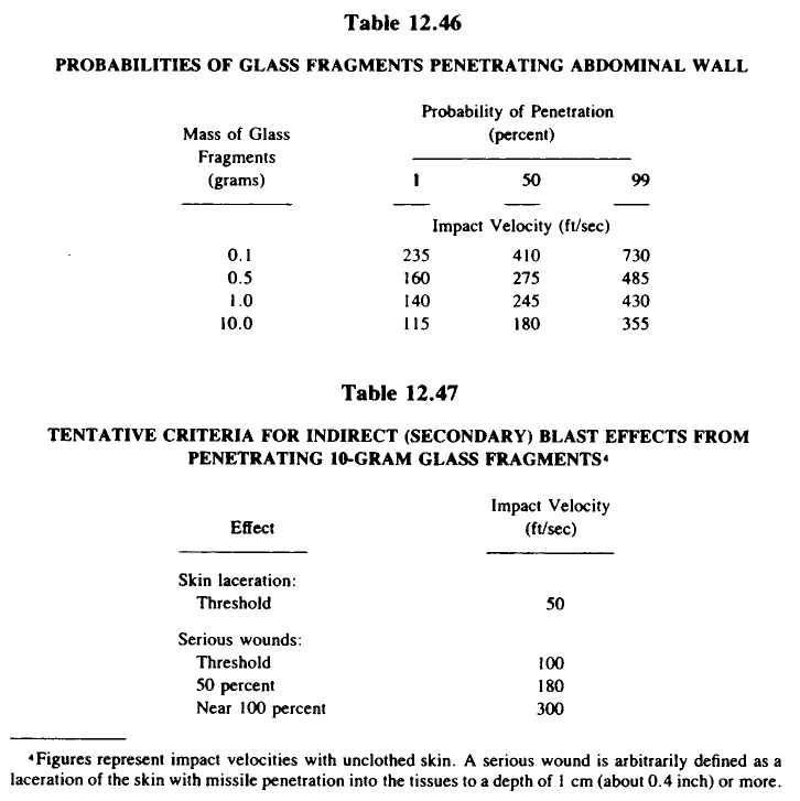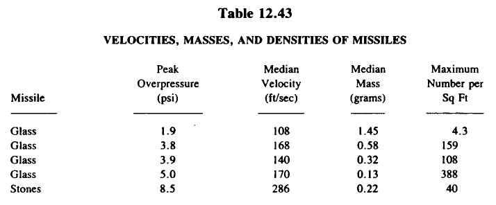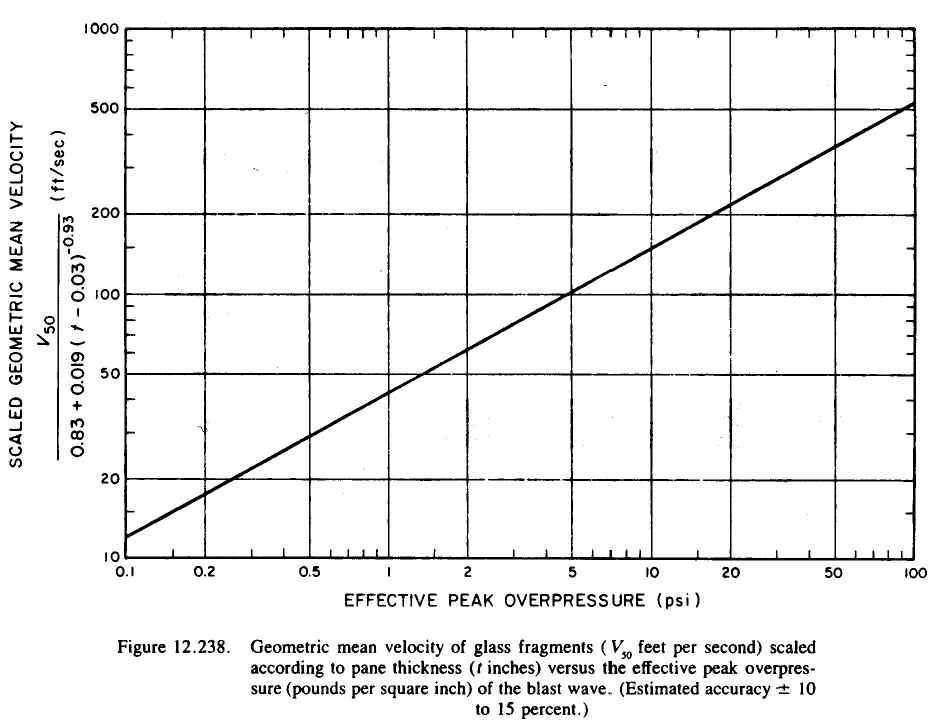 12.238 Glass fragments produced by air blast are a substantial hazard and the injuries they can cause are related to the velocities attained (§ 12.42). Measurements have been made of the fragments produced from glass panes, mounted in either steel or wood frames, when destroyed by the blast from nuclear (11 to 29 kilotons) or conventional (15 to 500 tons) explosions. The types of glass ranged from O.25-inch thick plate glass, through various standard thicknesses of single- and double-strength glass, to thin non-standard panes 0.064 inch thick. The results obtained can be represented, with an accuracy of roughly +/- 10 to 15 percent, by the straight line in Fig. 12.238. The geometric mean velocity, i.e., the anti-logarithm of the mean of the logarithms of the velocities, represented by V50 feet per second, is modified by an empirical scaling factor for the thickness (t inches) of the glass panes. The effective peak overpressure (pounds per square inch) is equal to the peak reflected overpressure if the glass is oriented face-on to the blast wave and it is the same as the incident peak overpressure if the pane is located on the side or back of a structure relative to the advancing shock front. From Fig. 12.238 the geometric mean velocity of the fragments can be determined for glass panes of any specified thickness exposed to a given effective peak overpressure.