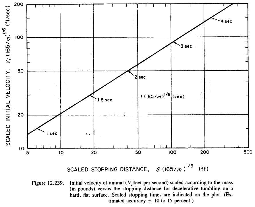 12.239 The results of the tests referred to in § 12.45, on the decelerative tumbling of various animal cadavers dropped onto a hard, flat surface at different velocities, are represented graphically in Fig. 12.239; the possible error is within the range of about :i: 10 to 15 percent. The initial velocity Vi feet per second and the stopping distance S feet are scaled for the mass of the animal (m pounds). Scaled stopping times are also shown. Thus, for a given initial velocity and animal mass, the stopping distance for decelerative tumbling may be derived directly from the linear plot and the corresponding stopping time may be determined by interpolation. Although the data were obtained from tests with animals, it is thought that the results can be applied to the decelerative tumbling of humans provided there is no significant bouncing.