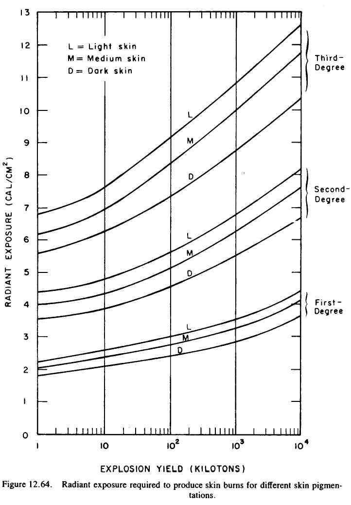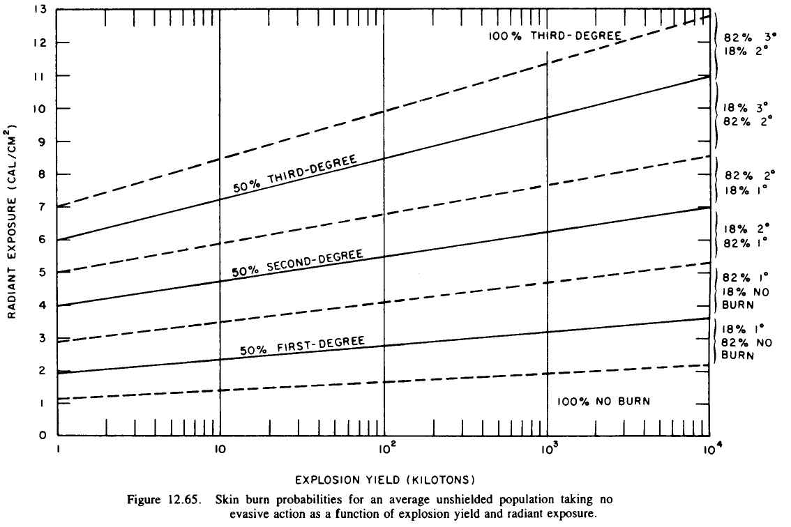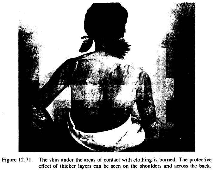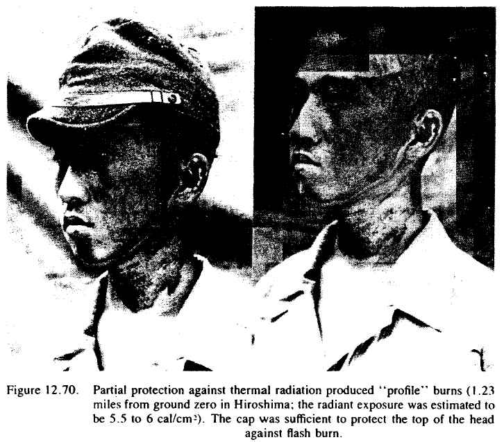 12.14 The high incidence of flash burns caused by thermal radiation among both fatalities and survivors in Japan was undoubtedly related to the light and scanty clothing being worn, because of the warm summer weather prevailing at the time of the attacks. If there had been an appreciable cloud cover or haze below the burst point, the thermal radiation would have been attenuated somewhat and the frequency of flash burns would have been much less. Had the weather been cold, fewer people would have been outdoors and they would have been wearing more extensive clothing. Both the number of people and individual skin areas exposed to thermal radiation would then have been greatly reduced and there would have been fewer casualties from flash burns.