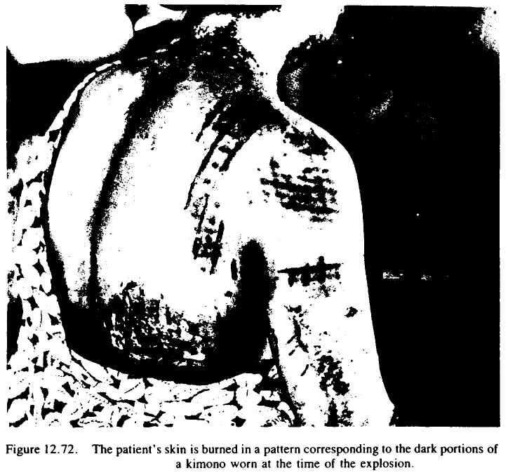 12.02 The frequency of burn injuries due to a nuclear explosion is exceptionally high. Most of these are flash burns caused by direct exposure to the pulse of thermal radiation, although individuals trapped by spreading fires may be subjected to flame burns. In addition, persons in buildings or tunnels close to ground zero may be burned by hot gases and dust entering the structure even though they are shielded adequately from direct or scattered thermal radiation. Finally, there are potential harmful effects of the nuclear radiations on the body. These represent a source of casualties entirely new to warfare.