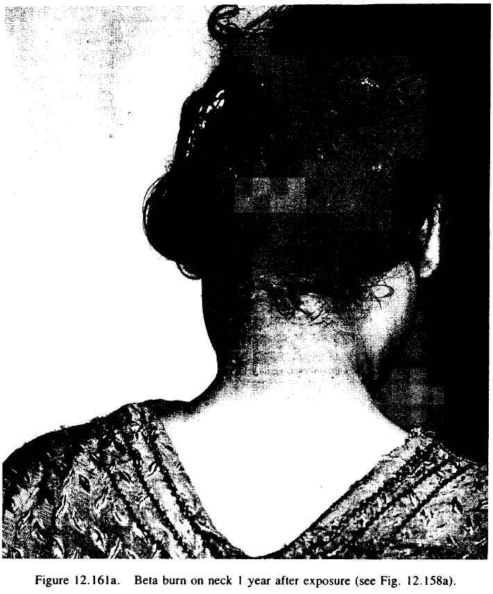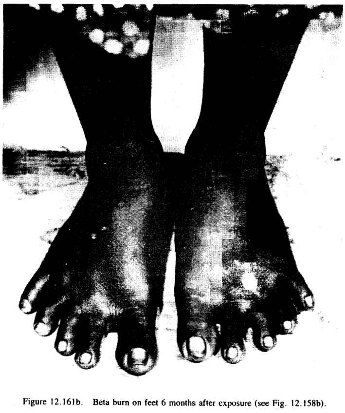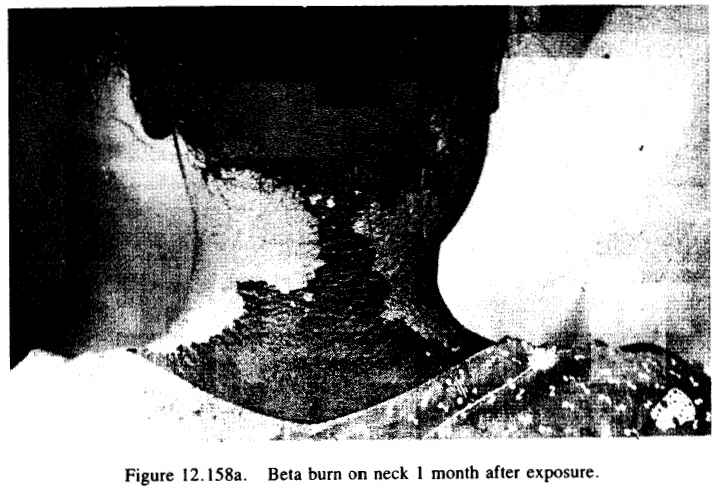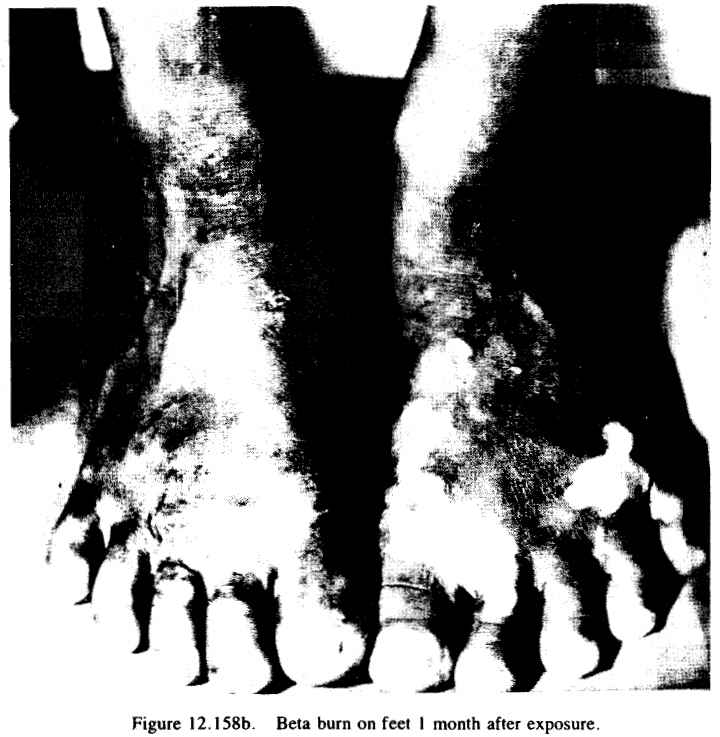 12.245 Skin injury caused by fallout was observed in cattle exposed at the TRINITY test (§ 2.36) and also in animals during atmospheric tests at the Nevada Test Site. Minor to severe injuries due to beta radiation have occurred, although none of the cattle died within 150 days of exposure. The skin injuries appeared to be similar to thermal burns except that the latter are soon visible whereas the effects of beta particles may not be seen for three or four weeks.