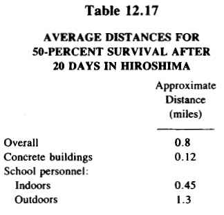 12.17 The death rate in Japan was greatest among individuals who were in the open at the time of the explosions; it was less for persons in residential (wood-frame and plaster) structures and least of all for those in concrete buildings. These facts emphasize the influence of circumstances of exposure on the casualties produced by a nuclear weapon and indicate that shielding of some type can be an important factor in survival. For example, within a range of 0.6 mile from ground zero over 50 percent of individuals in Japanese-type homes probably died of nuclear radiation effects, but such deaths were rare among persons in concrete buildings within the same range. The effectiveness of concrete structures in providing protection from injuries of all kinds is apparent from the data in Table 12.17; this gives the respective average distances from ground zero at which there was 50-percent survival (for at least 20 days) among the occupants of a number of buildings in Hiroshima. School personnel who were indoors had a much higher survival probability than those who were outdoors at the times of the explosions.