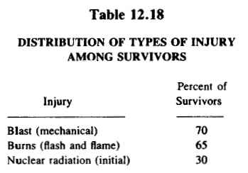 12.18 From surveys made of a large number of Japanese, a fairly good idea has been obtained of the distribution of the three types of injuries among those who became casualties but survived the nuclear attacks. The results are quoted in Table 12.18; the totals add up to more than 100 percent, since many individuals suffered multiple injuries.