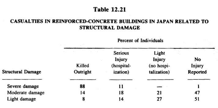 12.21 For people who were in buildings in Japan, the overall casualties were related to the extent of structural damage, as well as to the type of structure (§ 12.17). The data in Table 12.21 were obtained from a study of 1,600 Japanese who were in reinforced-concrete buildings, between 0.3 and 0.75 mile from ground zero, when the nuclear explosions occurred. At these distances fatalities in the open ranged from about 90 to 100 percent, indicating, once more, that people were safer inside buildings, even when no special protective action was taken because of the lack of warning. There may have been an increase of casualties in buildings from debris etc., but this was more than compensated by the reduction due to shielding against the initial nuclear radiation and particularly from the thermal pulse.