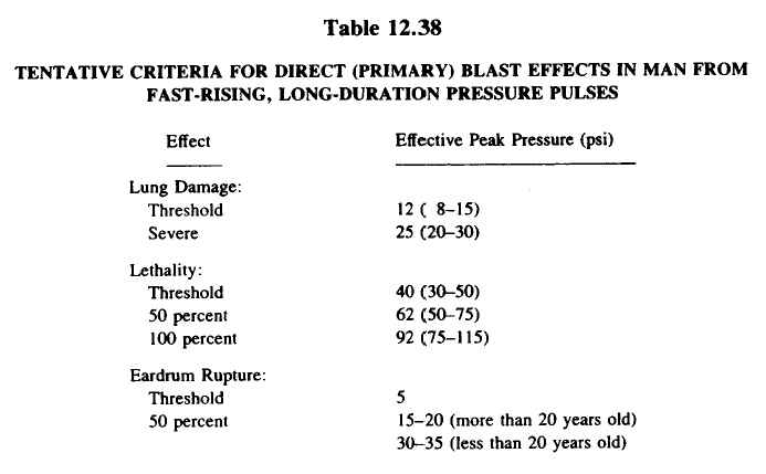 12.24 Blast injuries are of two main types, namely, direct (or primary) injuries associated with exposure of the body to the environmental pressure variations accompanying a blast wave, and indirect injuries resulting from impact of penetrating and non-penetrating missiles on the body or as the consequences of displacement of the body as a whole. There are also miscellaneous blast injuries, such as burns from the gases and debris, and irritation and possibly suffocation caused by airborne dust. The present section will treat direct injuries, and indirect blast effects will be discussed later.