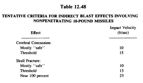 12.25 The general interactions of a human body with a blast wave are somewhat similar to that of a structure as described in Chapter IV. Because of the relatively small size of the body, the diffraction process is quickly over, the body being rapidly engulfed and subjected to severe compression. This continues with decreasing intensity for the duration of the positive phase of the blast wave. At the same time the blast wind exerts a drag force of considerable magnitude which contributes to the displacement hazard.