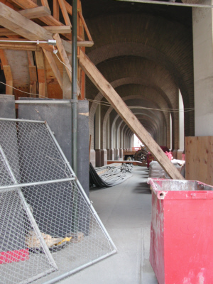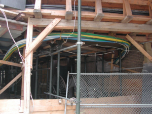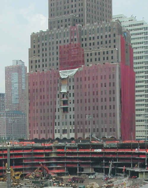 ![]() 40 West Street, temporary cables running along south arcade; at left they rise to the underside of sidewalk scaffold. Photo: Cryptome, 10 July 2002 |