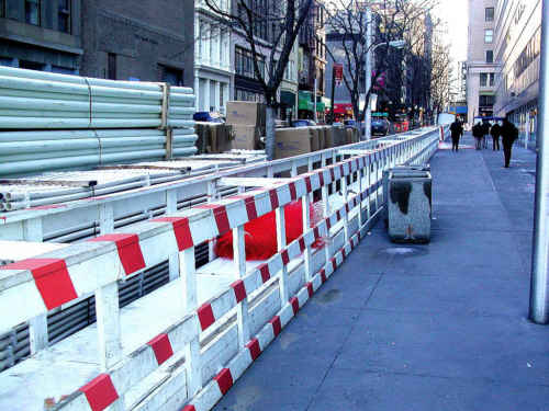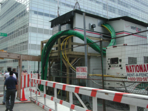 ![]() 40 West Street, temporary cables running under sidewalk scaffolding. Photo: Cryptome, 10 July 2002