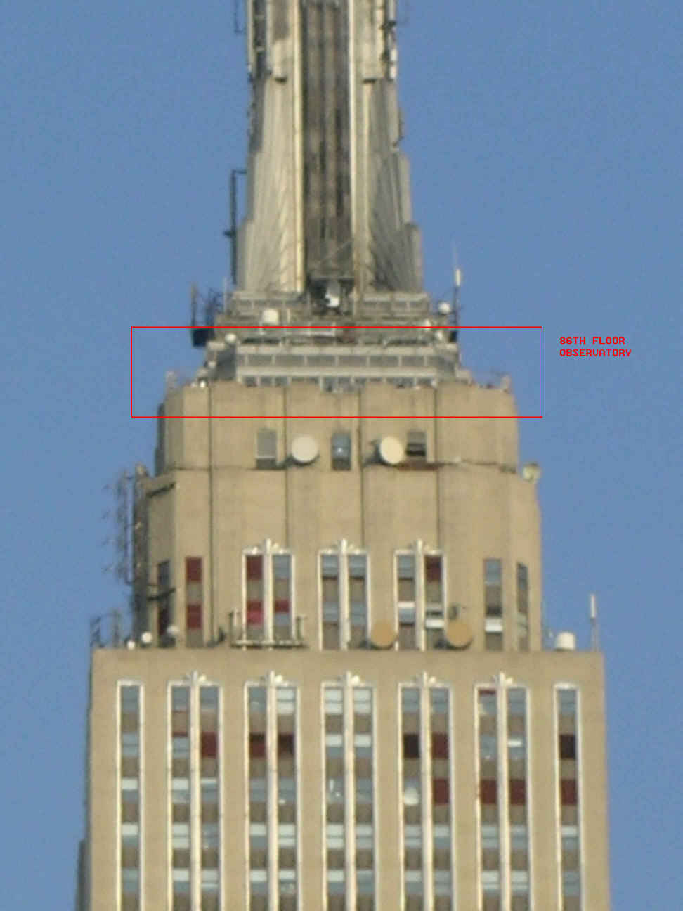 Cryptome toured the Empire State Building yesterday, took the photos below. ESB's located a couple of blocks east of Madison Square Garden where the Republican National Convention will be held, and offers a singular panoramic view of New York City, the Garden, the nightspots where the GOP nobbies will hoedown, and eyeball of targets galore outside and inside the building -- which itself is bragged locally to be No. 1 Iconic NYC Bullseye, "come rent courageously at a discount."