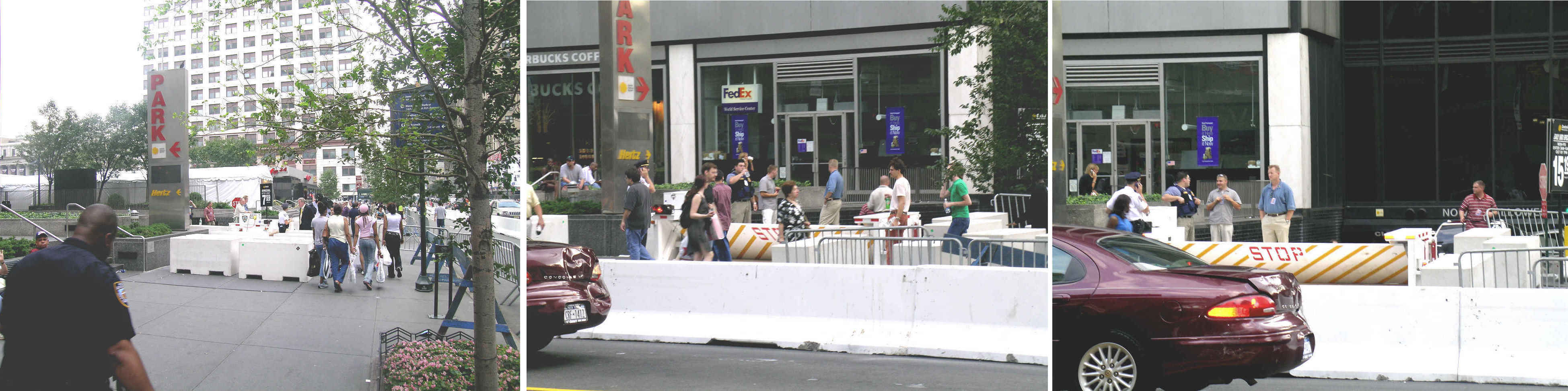 Spanking new concrete barriers were installed -- properly, not like the inept at the DNC -- with more being added as traffic was shut down for the convention. Boston used beat-up historic barricades at the DNC, laid Democratically irregularly, not worried too much about any real attack except by the media. NYC has brought in expensive, newly cast white-concrete barriers, free of grafitti and truck-bashing, as befits a rich, white, law and order GOP hoping to gain greater wealth from their valiant war against terrifying-defense-spending-cut-back. In this gated-community security looked pretty good, the rest of the city can kiss ass goodbye.