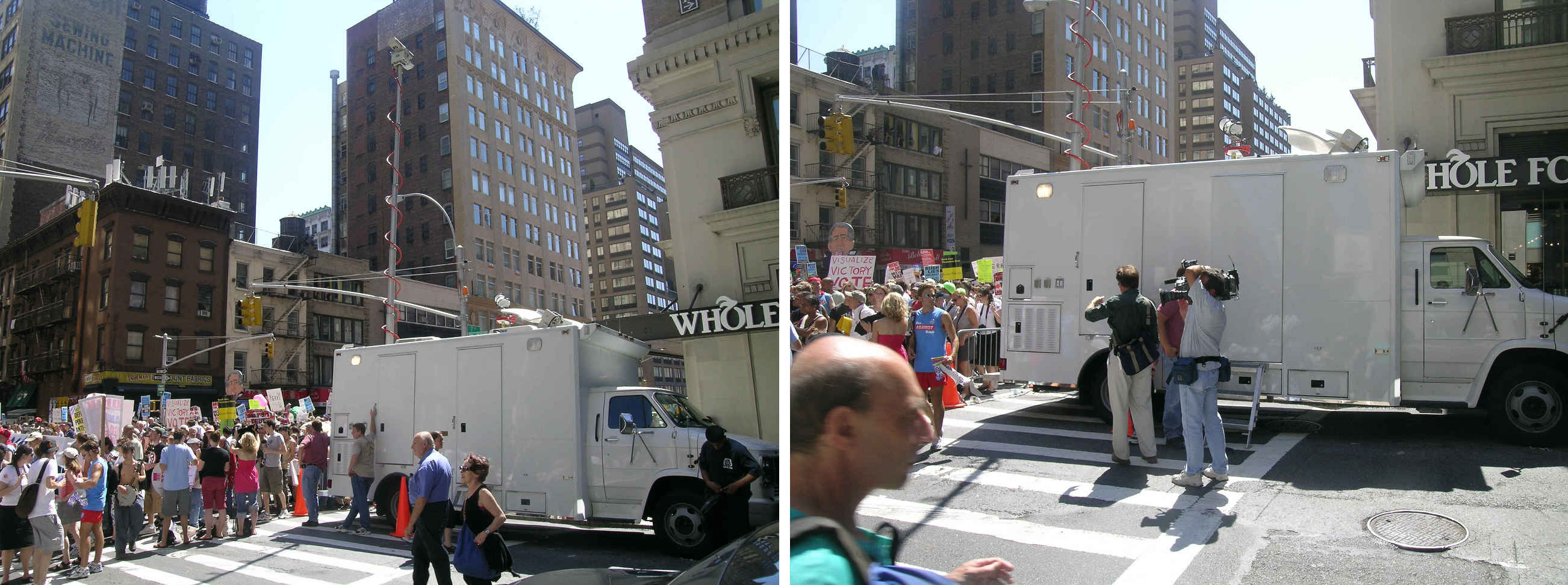 Unmarked police (and/or federal) surveillance van at 7th Avenue and West 25th Street. Atop is a high-mast video camera and a very-high-decibel crowd-supression speaker. The plainclothes camera crew at right had just come out of the truck to begin circulating among the crowd and taping. Seen inside while the van door was open was densely-packed recording and monitoring equipment. Nothing showed the cops or their vehicle were not journalists, except a complete lack of overt ID journalists exhibit. |