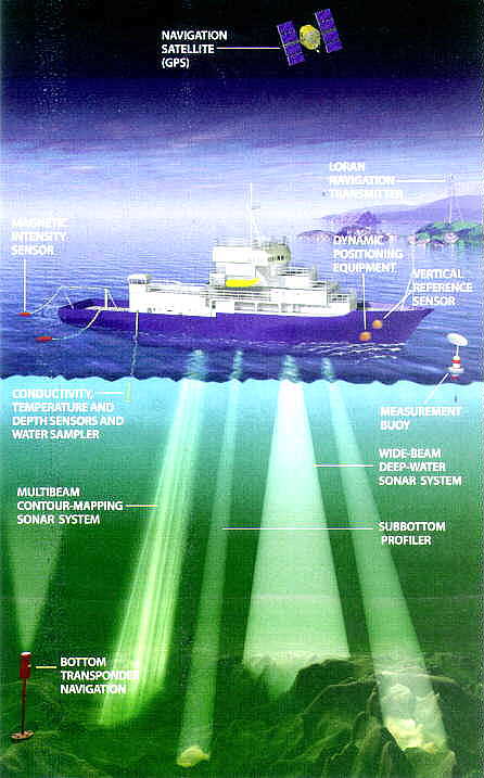 1950 to present | Multi-beam contour mapping system; wide-beam deep-water system; subbottom profiler |