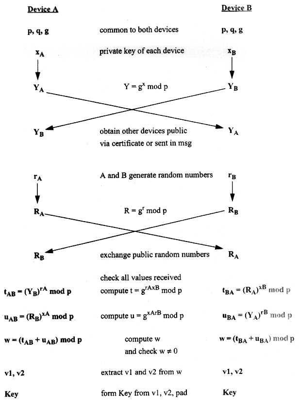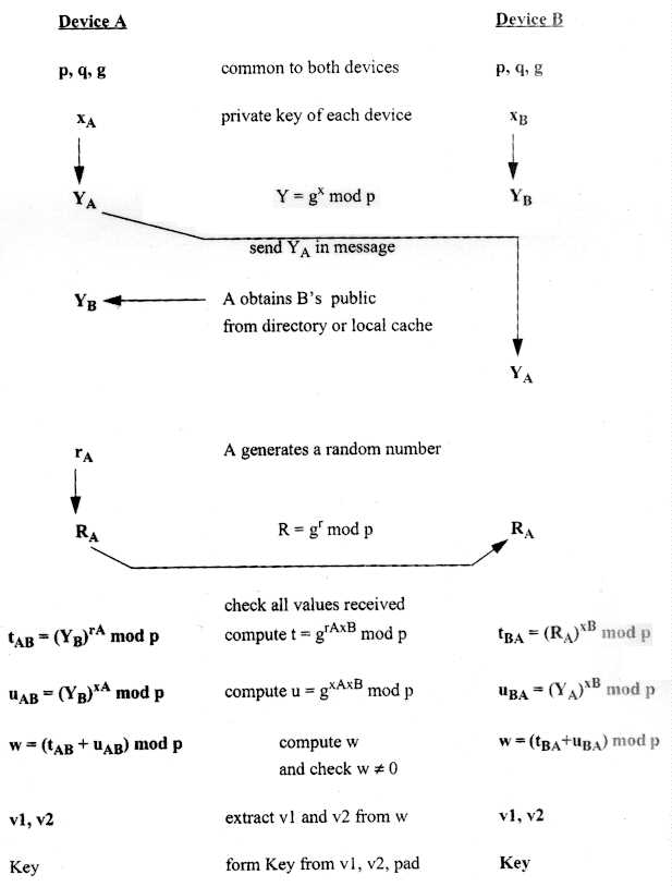 b. Each device validates the public key Y to determine that it is indeed the public key of a valid user on the network. If the validation fails, the process terminates. If the validation checks, go to step c.c. Each device exchanges the random component. Device A generates a 160-bit private random number rA and sends the public version of this number