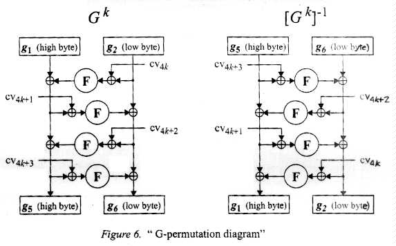 5. G-permutation: The cryptovariable-dependent permutation G on V16 is a four-round Feistel structure. The round function is a fixed byte-substitution table (permutation on V8), which will be called the F-table. Each round of G also incorporates a byte of cryptovariable. We give two characterizations of the function below: