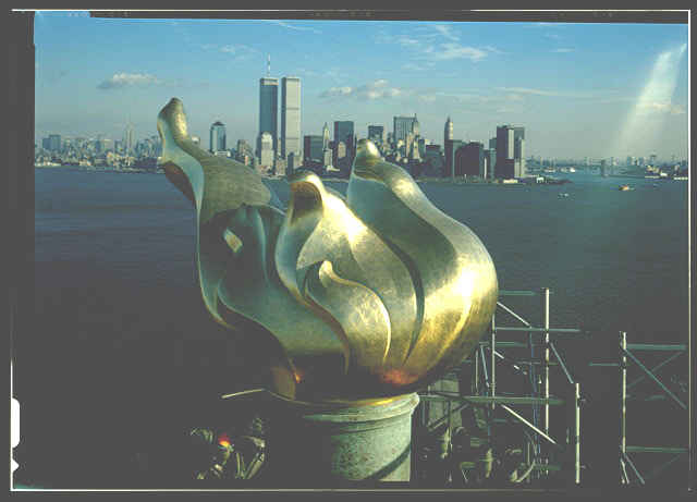 278. DETAIL OF FLAME WITH MANHATTAN SKYLINE IN BACKGROUND HAER, NY,31-NEYO,89-278 [After "restoration"]