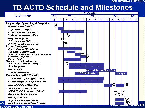 TECHNICAL APPROACH: The TB ACTD will be co-managed by the DTRA Technical Manager and the USFK Operational Manager. The Naval Surface Warfare Center, Indian Head will lead the payload development technical efforts. The Air Force Air Armament Center, Precision Strike System Program Office will conduct required aircraft/weapon system integration. The following paragraphs provide summary of technical approach.