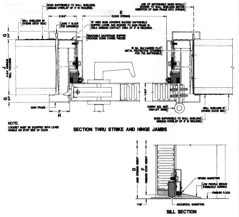 The door and frame unit is furnished complete with hardware, is mortised, reinforced and appropriately drilled and tapped per template for installation of hardware. The hinges are full mortise template, non-removable pin, stainless steel, cam-lift type of proprietary design. The lockset conforms to Federal Specification, Type 86 and 87 and meets ANSI A156.2 grade 1. The closer is a non-handed, multi-size type with adjustable sizes 2 thru 6 and can be installed regular parallel or top jamb mounted. The closer conforms to Federal Specification Type, FF-H-121 C, FF-H-121 D and ANSI type A156.4. Threshold is low profile type extruded bronze of proprietary design that provides a contact surface for the RFI/EMI and acoustical gaskets to seal against.