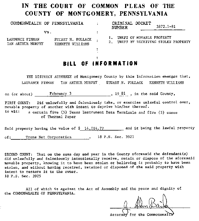 As you can see by reading this Bill of Information, Ian Murphy was never charged with any type of computer and phone phreaker crimes. Instead, he was charged with theft, period.