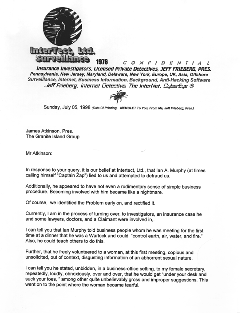 Several years back, when he was living in Plymouth, MA; Ian Murphy contacted the author and tried to gain employment. Even the most basic of interviews or meetings was refused as he obviously lying about his credentials and trying to defraud the author. Ian's resume was fully of absolute falsehoods, and his list of credentials was obviously bogus. When he was refused employment or even an interview, Ian initiated a series of harassing phone calls against the author and launched into numerous screaming tirades over the phone.