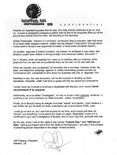 On a related matter, during the Fall of 1997 Ian Murphy stole a number of copyrighted graphics and text from this authors website, and blatantly copied them to his own site. Not realizing that the site was his (it was under an alias), the author sent the site owner and ISP a series of email politely requesting removal of the offending materials (which where ignored). After several weeks the author contacted the ISP where the files were hosted, and proved to them that the materials being used constituted a criminal violation. They investigated, agreed, and promptly deleted the materials in question, and further discovered they were hosted on a fraudulent account which they shutdown. Mr. Murphy then cranked up another round of series of obscene phone calls, and harassing e-mail/messages which where all traced to him using aliases. In turn this resulted in him be bounced off dozens of ISPs (where he had set up fraudulent accounts).