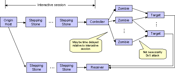 Exfiltrated information may go to a receiver host that, in turn, is separated from the originating host by a series of stepping stone machines. The originating host, stepping stones, controller, zombies, and receiver hosts might be considered part of an uncooperative environment. Some of the zombies and the target machine(s) would be sited within a cooperative environment, where "cooperation" means that the IC may influence the content, configuration and operation of the hosts. Others may reside within uncooperative or hostile sites. Figure 1 provides a schematic of such an attack structure described above.