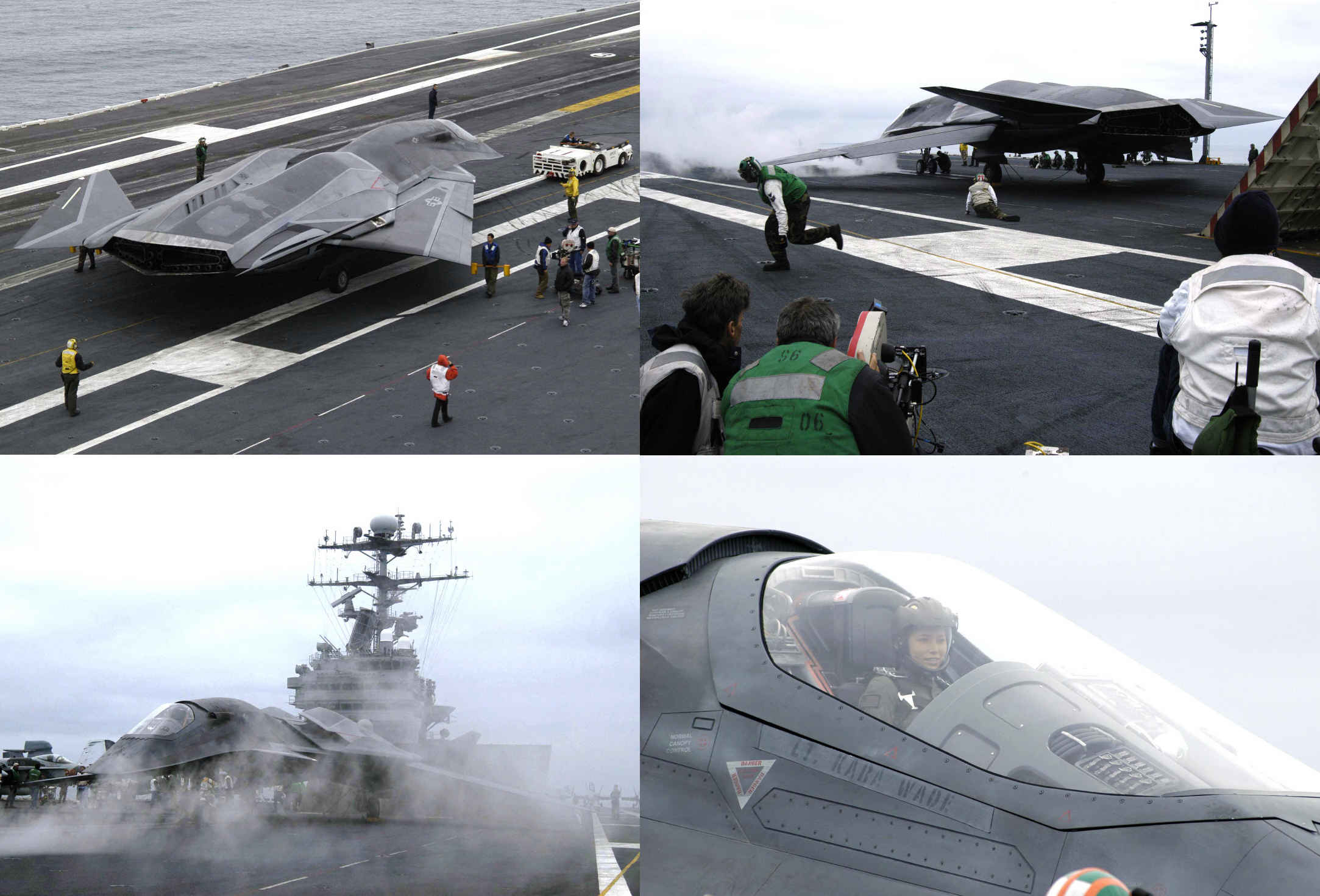 19 July 2004. Several readers have confirmed that the aircraft is indeed a prop for a movie called "Stealth." Thanks to T, the original photo has been replaced by a composite of these four US Navy photos: