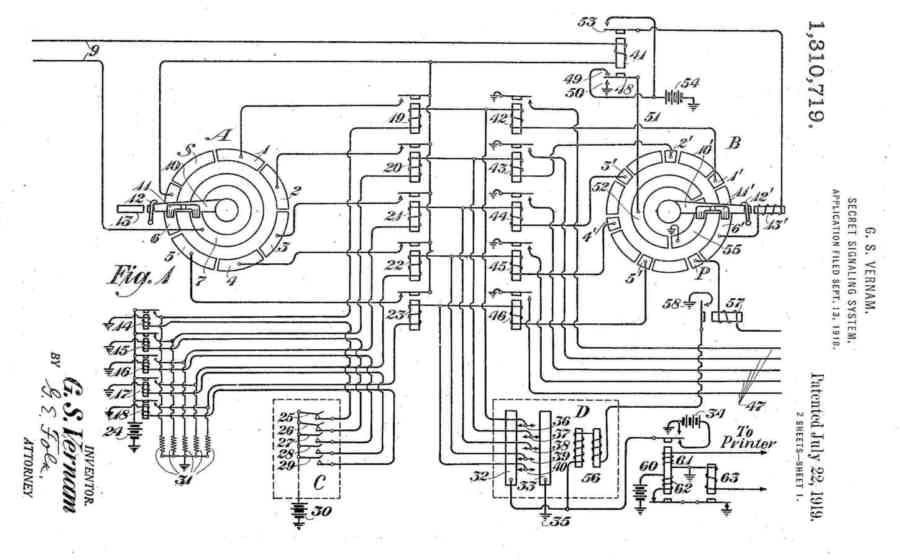 GILBERT S. VERNAM, OF BROOKLYN, NEW YORK, ASSIGNOR TO AMERICAN TELEPHONE SECRET SIGNALING SYSTEM. ________________________ 1,310,719. Specification of Letters Patent. Patented July 22, 1919. Application filed September 13, 1918. Serial No. 253,962. To all whom it may concern: Be it known that I, Gilbert S. Vernam, residing at Brooklyn, in the County of Kings and State of New York, have invented certain Improvements in Secret Signaling Systems, of which the following is a specification. This invention relates to signaling systems and especially to telegraph systems. Its object is to insure secrecy in the transmission of messages and, further, to provide a system in which messages may be transmitted and received in plain characters or a well-known code but in which the signaling impulses are so altered before transmission over the line that they are unintelligible to anyone intercepting them. The invention is here illustrated as applied to a well-known form of printing telegraph systems but, as will be readily understood, it is applicable to other signaling systems. The invention will be more fully described in connection with the accompanying drawings, in which Figure 1 illustrates circuit arrangements at one end of the line in a system embodying the invention, and Figs. 2 and 3 show modifications in the circuits of the sending apparatus. Like sending and receiving apparatus is located at each end of the line. Normally the message is recorded by both the local and the distant receiving apparatus and since their operation is identical it will be unnecessary to show and describe the opposite end of the line.