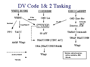 3.2.2 Tasking requests for DV Code 1 and DV Code 2 airlift come to the designated executive airlift squadrons through offices and commands designed to assure prompt support and necessary supervision. Tasking for DV Code 1 is direct and efficient from the White House Military Office (WHMO) to the Office of the Assistant Vice Chief of Staff/Special Air Missions (CVAM), and on to either the PPO or HMX-1. Additional needed support for Secret Service personnel, baggage, cars, etc., is tasked from WHMO to CVAM and thence to Tanker Airlift Control Center (TACC) at Air Mobility Command (AMC) to be passed to major commands (MAJCOMs) and wings for continental United States (CONUS) forces. DV Code 2 tasking flows from the requesting source in the manner of DV Code 1 general support tasking to CVAM and to 89 AW for available support and thence to TACC and the Air Force MAJCOMs for airlift support from the wings and from the theater CINCs, when overseas in-theater travel is desired.