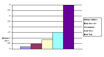 2.2 Those organizations dedicated to VIP or civil airlift have achieved exceedingly low accident rates. Regardless, there is a perception among many passengers that flying is unsafe. It appears that this is the perception of many in the media. No matter how good the aviation safety record, or how low the risk is to fly, compared with other modes of travel, the specter of imminent danger seems to exist. This is not to say that the risk, no matter how low, is acceptable, but rather that reasoned analysis will show risk to be much lower than perceived. The civil airlines have occasional tragic accidents but when viewed on the scale of the number of flying hours or the number of flights, risk is exceedingly low. The same is true for business aviation. Those military units dedicated to the airlift requirements of government DV Codes 1, and DV Codes 2, have safety records that are as good or better than civil transport. Still aviation accidents do occur more frequently in military tactical airlift aircraft providing general support Executive airlift. This caused us to look farther.