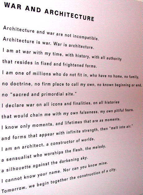 Lebbeus Woods, architect and theorist, will have an exhibit of his work, titled La Chute, opening 25 October 2002 at the Cartier Foundation in Paris, a show curated by Paul Virilio entitled Unknown Quantities, or Ce qui arrivé, or shit happens.