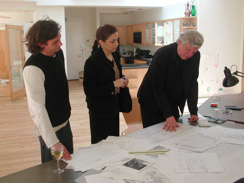 Woods describes the exhibit to Natsios and Alexis, utilizing construction drawings of the Cartier Foundation building. |