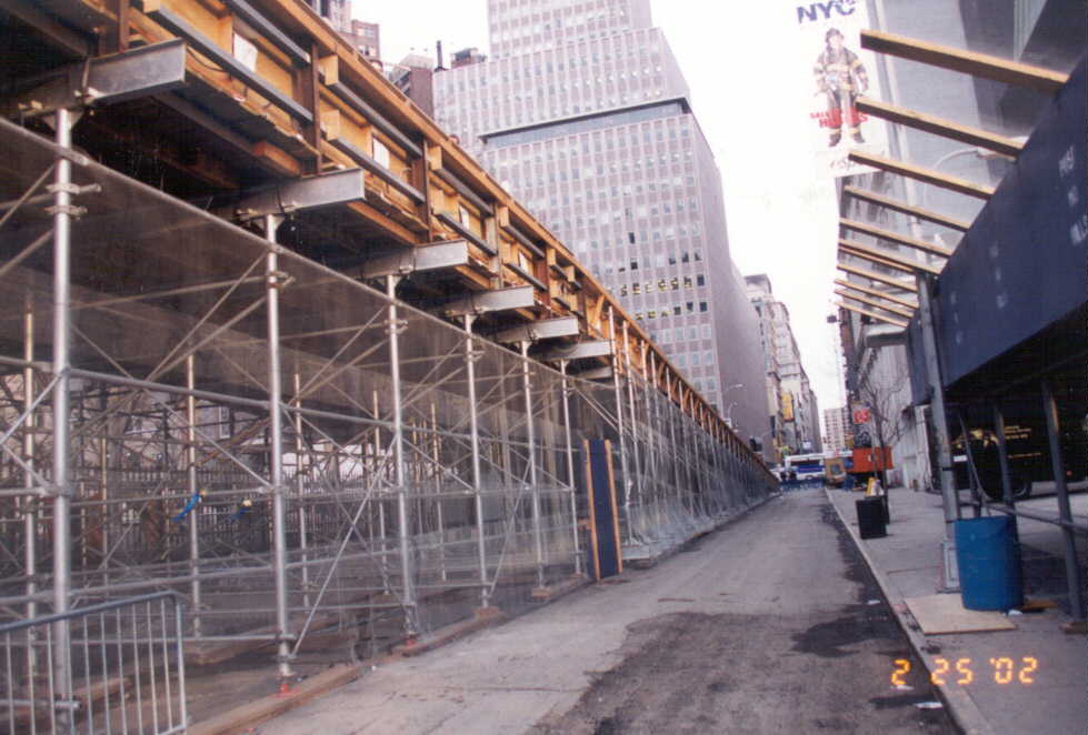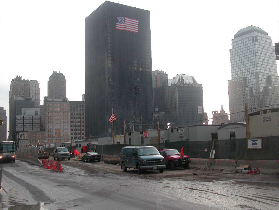 4 March 2002. Entrance to WTC recovery and construction site, looking west from Church Street. American Express building under repair at right distance.
