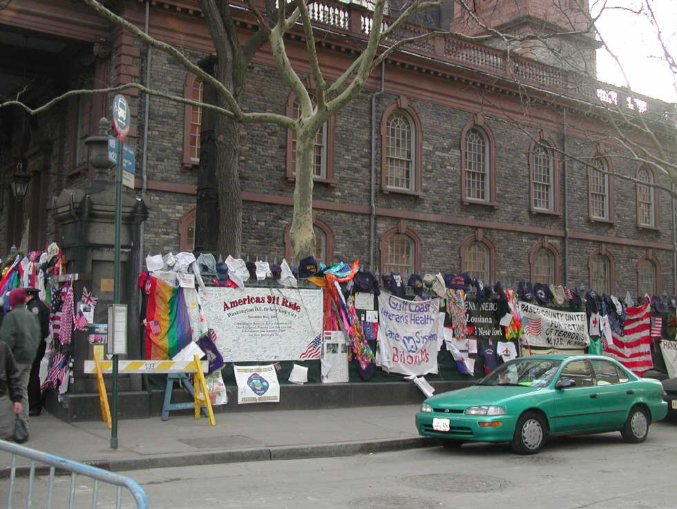 Memorials in front of St. Paul's Chapel, on Broadway sidewalk, looking south.
