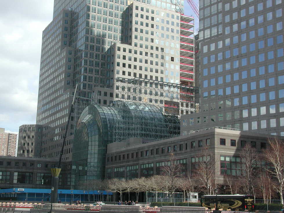 Wintergarden Pavilion at World Financial Center with exterior glazing being rebuilt; American Express tower at right.